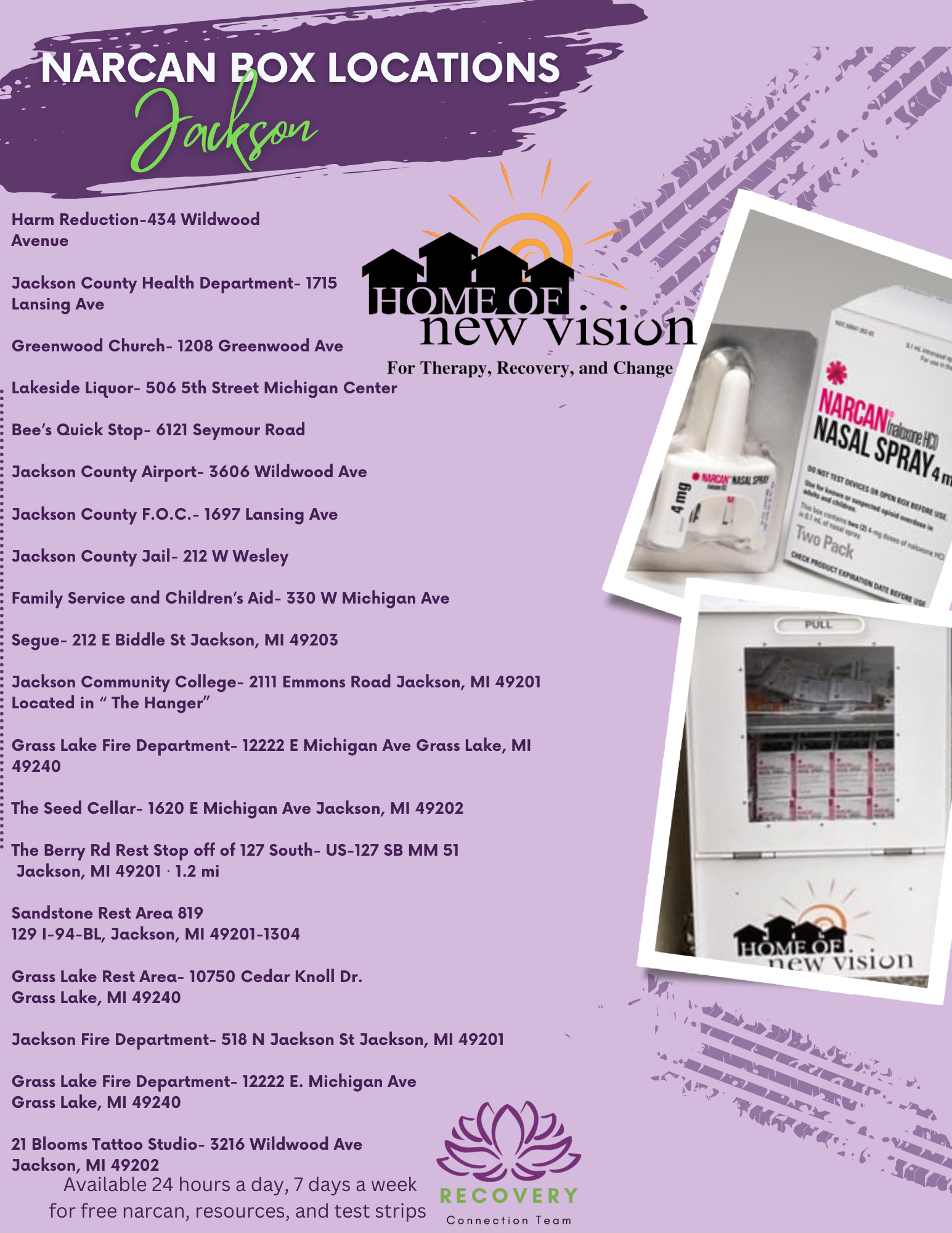 The Narcan box is stocked with Naloxone (commonly known as Narcan), a medication designed to rapidly reverse opioid overdoses, as well as informational literature on opioid addiction resources available within the Jackson community. Home of New Vision will be responsible for maintaining and restocking the box, ensuring continued access to these critical supplies.